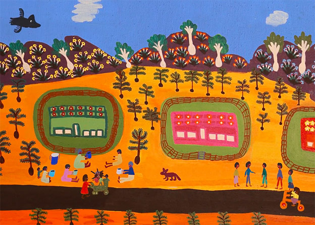 This short film tells a special family story shared by painter (Kunmanara) Margaret Nampitjinpa Boko in her 2013 painting on canvas “Tjulpu & Papa” (Hawk and Dog). The animation collages images of people, animals, trees, hills, roads, and houses from other painted stories, playing new roles in the retelling of this intimate story of place, family, and community, while remembering Boko’s legacy in art making and storytelling.